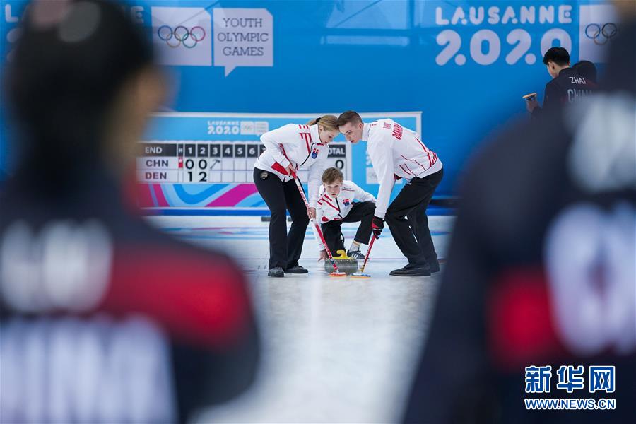 1月14日,丹麦队选手纳塔莉· 维克斯滕、乔纳森·维兰兹和基利安·图内(从左至右)在比赛中。 当日,第三届冬季青年奥林匹克运动会冰壶混合团体赛B组循环赛在瑞士尚佩里冰壶馆举行,中国队以3比9不敌丹麦队,无缘四分之一决赛。 新华社记者白雪骐摄