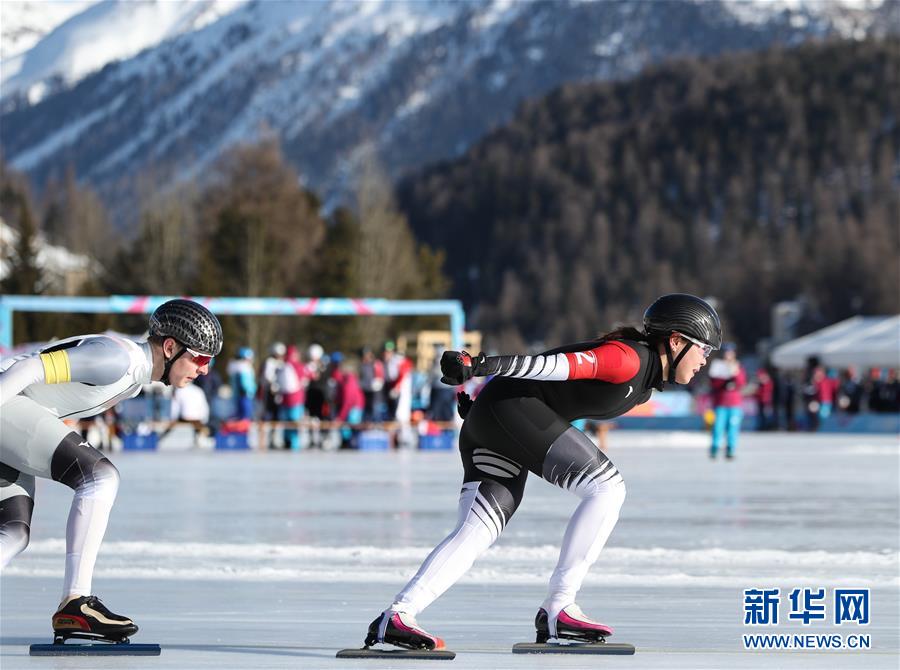 1月15日,来自第二队的中国选手王晶漪(右)在比赛中,最终第二队以2分09秒32的成绩获得第11名。 当日,第三届冬季青年奥林匹克运动会速度滑冰混合团体追逐赛在瑞士圣莫里茨湖上进行。 新华社记者程婷婷摄