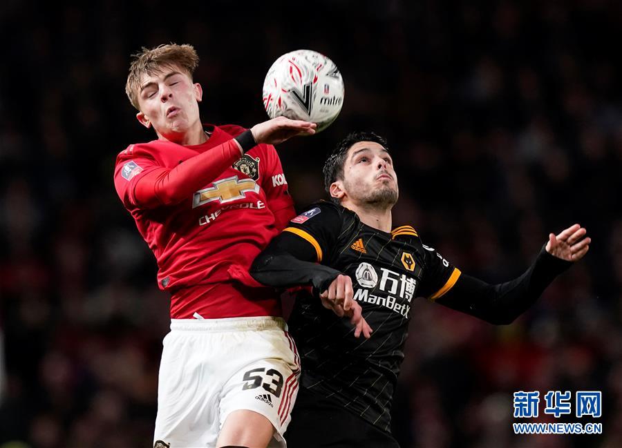 1月15日,曼联队球员威廉姆斯(左)与狼队球员内托在比赛中争顶头球。 当日,在2019-2020赛季英格兰足总杯第三轮的一场重赛中,曼彻斯特联队主场以1比0战胜狼队,晋级下一轮。 新华社/路透