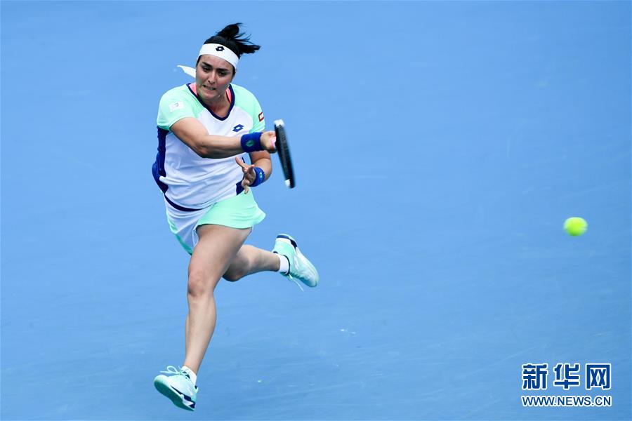 1月21日,贾贝乌尔在比赛中回球。 当日,在澳大利亚墨尔本进行的澳大利亚网球公开赛女子单打首轮比赛中,突尼斯选手贾贝乌尔以2比0战胜英国选手孔塔,晋级下一轮。 新华社记者朱炜摄