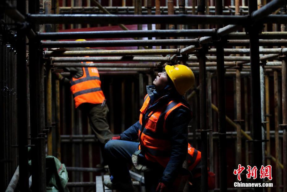 1月16日,建筑工人李德成在搭建脚手架。鼠年新春将至,在2021年成都世界大学生夏季运动会(以下简称“成都大运会”)建设工地,各项赛事基础设施的建设仍在如火如荼地进行中,工程建设者们以饱满的热情坚守在各自的工作岗位上。据了解,成都大运会将于2021年8月8日至19日在四川省成都市举行。中新社记者 王磊 摄