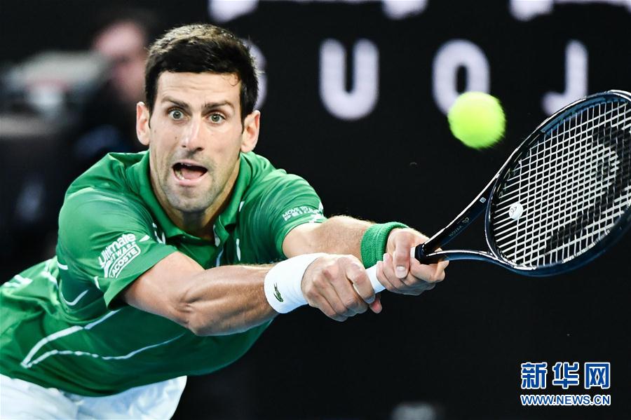 2月2日,焦科维奇在比赛中回球。 当日,在澳大利亚墨尔本进行的澳大利亚网球公开赛男子单打决赛中,塞尔维亚选手焦科维奇以3比2战胜奥地利选手蒂姆,夺得冠军。 新华社记者 朱炜 摄
