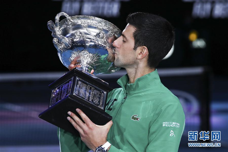 2月2日,焦科维奇在颁奖仪式上亲吻奖杯。 当日,在澳大利亚墨尔本进行的澳大利亚网球公开赛男子单打决赛中,塞尔维亚选手焦科维奇以3比2战胜奥地利选手蒂姆,夺得冠军。 新华社记者 王婧嫱 摄