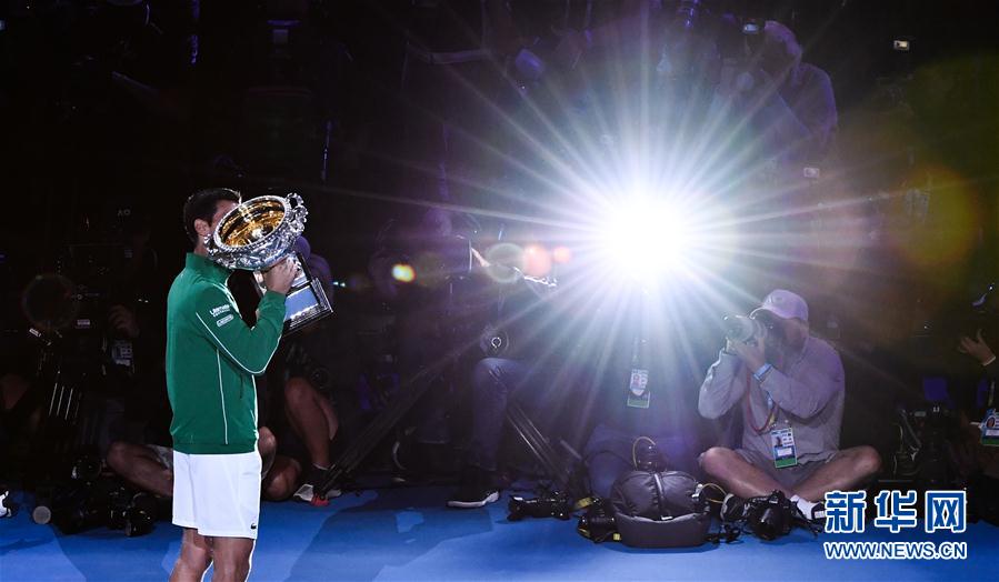 2月2日,焦科维奇在颁奖仪式上亲吻奖杯。 当日,在澳大利亚墨尔本进行的澳大利亚网球公开赛男子单打决赛中,塞尔维亚选手焦科维奇以3比2战胜奥地利选手蒂姆,夺得冠军。 新华社记者 朱炜 摄