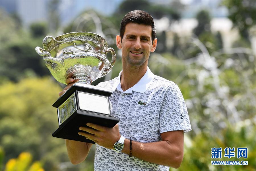 2月3日,焦科维奇与奖杯合影。 当日,2020年澳大利亚网球公开赛男子单打冠军、塞尔维亚选手焦科维奇来到墨尔本的维多利亚皇家植物园展示奖杯。 新华社发 (白雪摄)