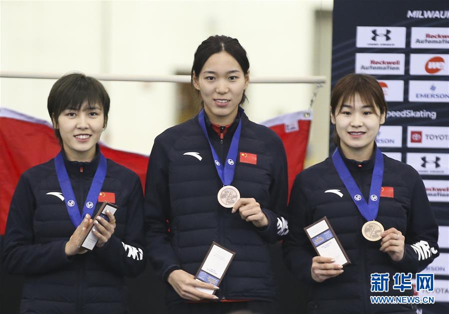 2月2日,中国队选手陈翔宇(中)、阿合娜尔·阿达克(左)和马语含在颁奖仪式上。 当日,国际滑联四大洲速滑锦标赛女子团体追逐赛在美国密尔沃基结束。由陈翔宇、马语含和阿合娜尔·阿达克组成的中国队以3分14秒153的成绩获得铜牌。 新华社记者 李颖 摄