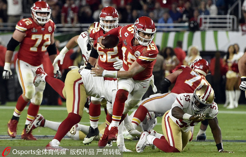 人民网北京2月4日电 北京时间昨天,第54届超级碗暨NFL总决赛在迈阿密硬石体育场落下大幕。最终,堪萨斯城酋长在第四节实现大逆转,以31比20击败旧金山49人。时隔50年,队史第二次捧起隆巴迪杯。