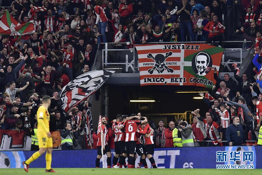 2月6日,毕尔巴鄂竞技队球员庆祝进球。 当日,在2019-2020赛季西班牙国王杯四分之一决赛中,巴塞罗那队客场以0比1不敌毕尔巴鄂竞技队,无缘半决赛。 新华社/美联