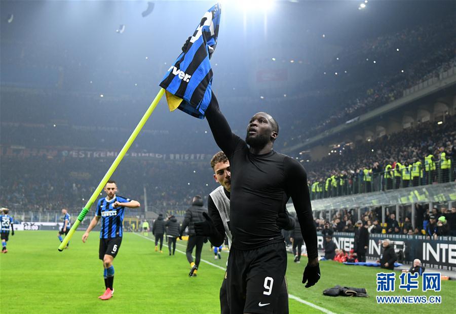 2月9日,国际米兰队球员卢卡库(前)在进球后庆祝。 当日,在2019-2020赛季意大利足球甲级联赛第23轮比赛中,国际米兰队主场以4比2战胜AC米兰队。 新华社发(阿尔贝托·林格里亚摄)