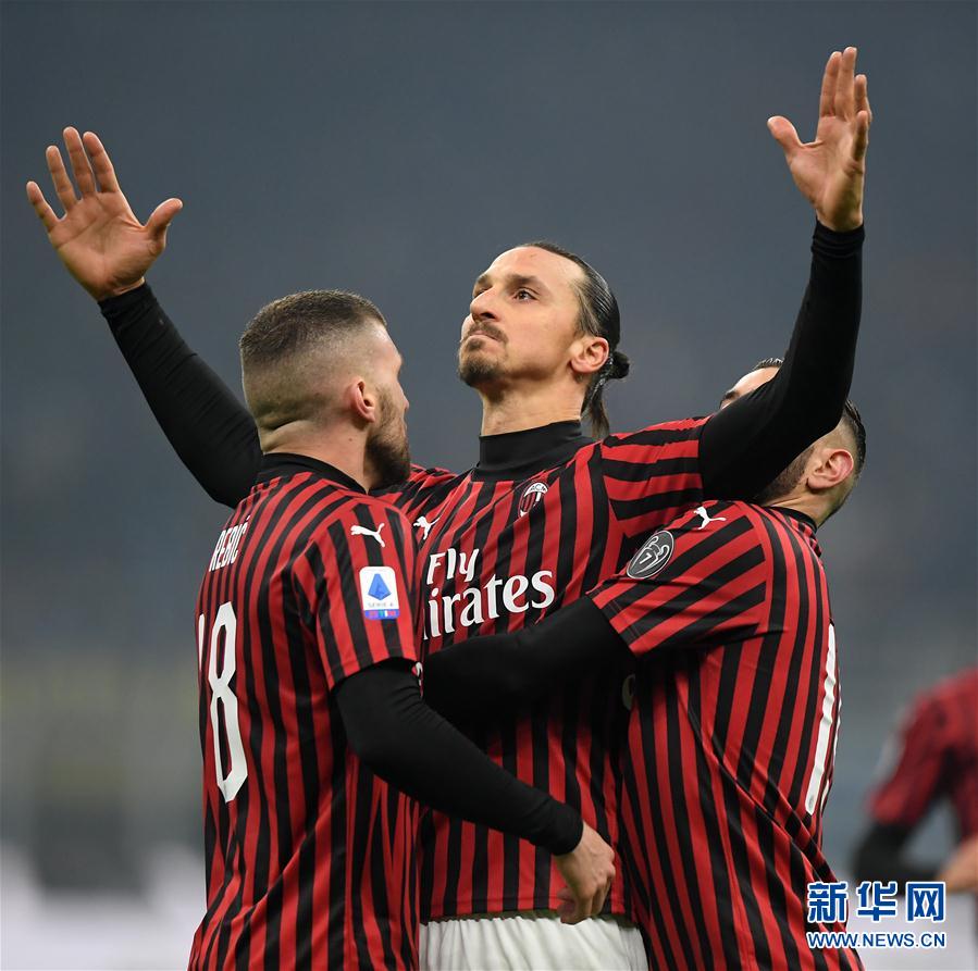 2月9日,AC米兰队球员伊布拉希莫维奇(中)在进球后和队友庆祝。 当日,在2019-2020赛季意大利足球甲级联赛第23轮比赛中,国际米兰队主场以4比2战胜AC米兰队。 新华社发(阿尔贝托·林格里亚摄)