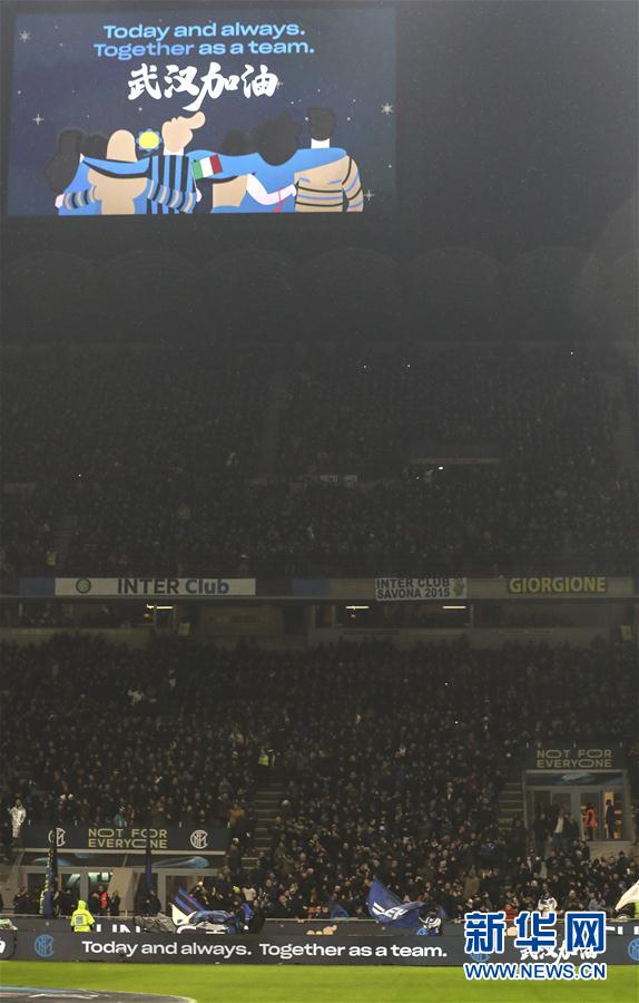 2月9日拍摄的球场大屏幕显示出“武汉加油”字样。 当日,在2019-2020赛季意大利足球甲级联赛第23轮比赛中,国际米兰队主场以4比2战胜AC米兰队。 新华社记者程婷婷摄