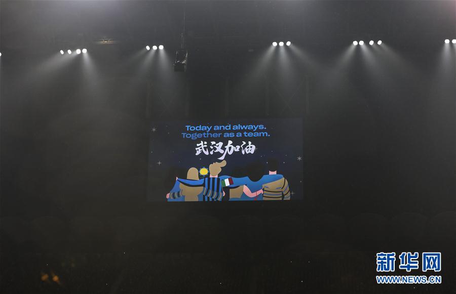 2月9日拍摄的球场大屏幕显示出“武汉加油”字样。 当日,在2019-2020赛季意大利足球甲级联赛第23轮比赛中,国际米兰队主场以4比2战胜AC米兰队。 新华社记者程婷婷摄