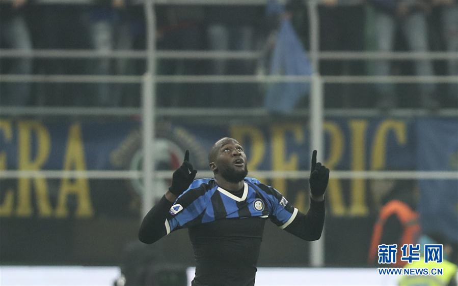 2月9日,国际米兰队球员卢卡库在进球后庆祝。 当日,在2019-2020赛季意大利足球甲级联赛第23轮比赛中,国际米兰队主场以4比2战胜AC米兰队。 新华社记者程婷婷摄