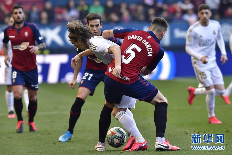 2月9日,皇家马德里队球员莫德里奇(左二)在比赛中和奥萨苏纳队球员戴维·加西亚(右二)拼抢。 当日,在2019-2020赛季西班牙足球甲级联赛第23轮比赛中,皇家马德里队客场以4比1战胜奥萨苏纳队。 新华社/美联