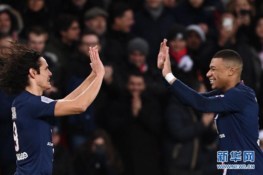 2月9日,巴黎圣日耳曼队球员卡瓦尼(左)在比赛中和队友姆巴佩庆祝进球。 当日,在2019-2020赛季法国足球甲级联赛第24轮比赛中,巴黎圣日耳曼队主场以4比2战胜里昂队。 新华社/法新