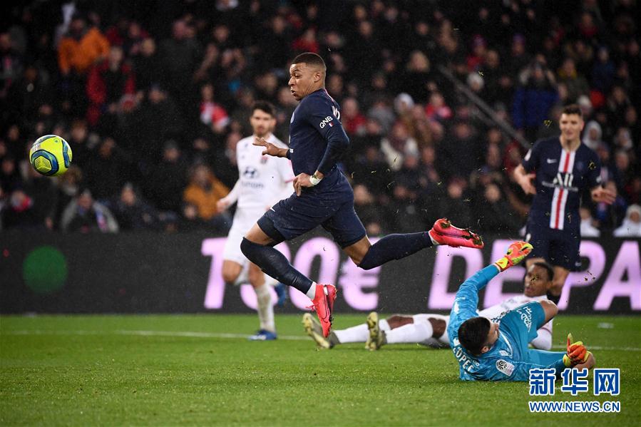 2月9日,巴黎圣日耳曼队球员姆巴佩(左)在比赛中射门得分。 当日,在2019-2020赛季法国足球甲级联赛第24轮比赛中,巴黎圣日耳曼队主场以4比2战胜里昂队。 新华社/法新