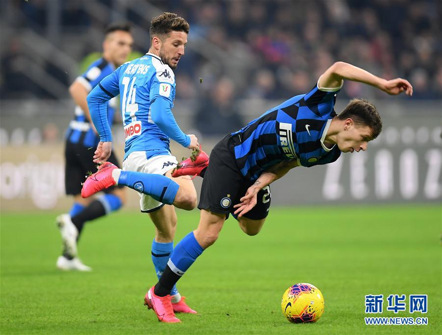 2月12日,那不勒斯队球员梅尔滕斯(左)和国际米兰队球员巴雷拉拼抢。 当日,在2019-2020赛季意大利杯足球赛半决赛首回合比赛中,那不勒斯队客场以1比0战胜国际米兰队。 新华社/路透