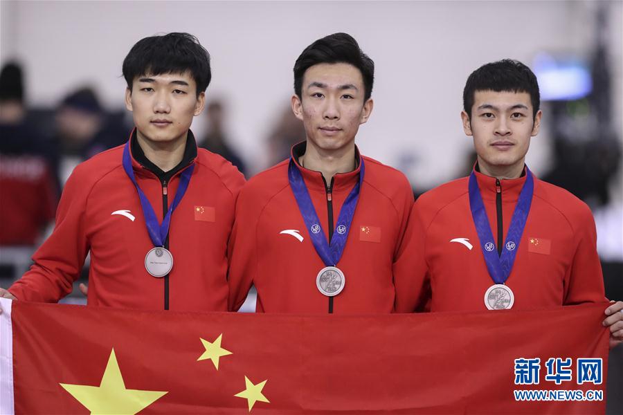2月13日,中国队选手高亭宇、王世伟、宁忠岩(从左至右)在男子团体竞速赛颁奖仪式上。 当日,在美国盐湖城举行的2020年世界单项速滑锦标赛男子团体竞速赛中,中国队以1分18秒533的成绩获得亚军。 新华社发(马特·赫尔普摄)