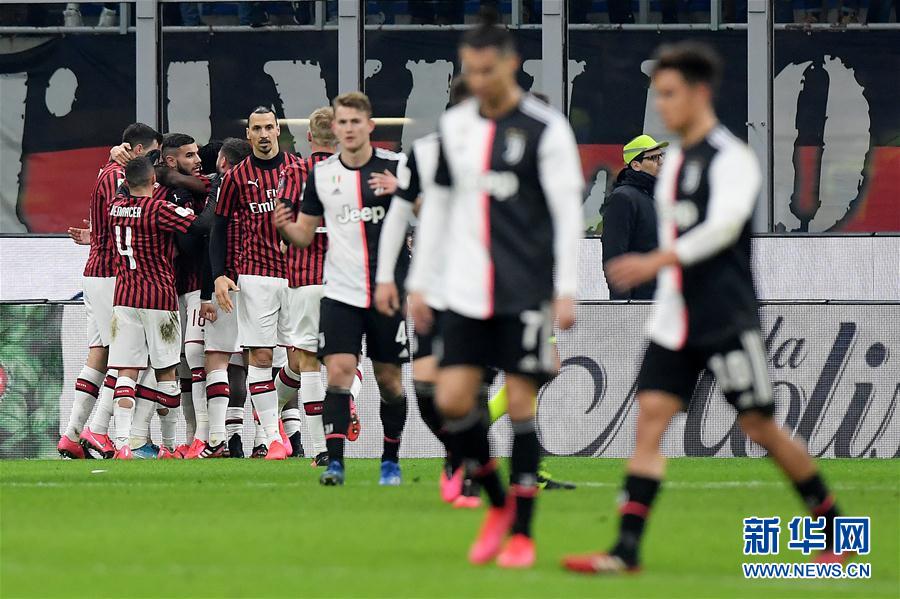 2月13日,AC米兰队球员(左)在比赛中庆祝进球。 当日,在2019-2020赛季意大利杯足球赛半决赛首回合比赛中,AC米兰队主场以1比1战平尤文图斯队。 新华社/路透