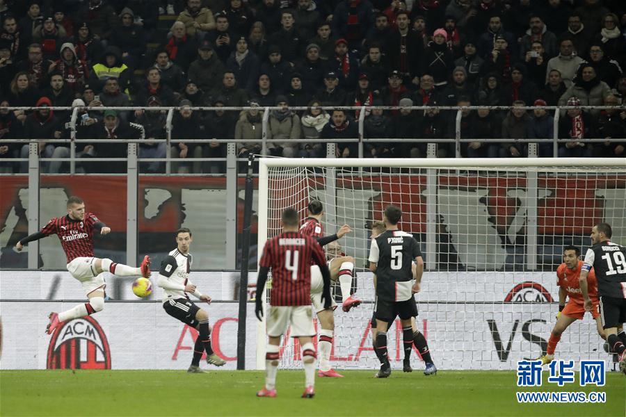 2月13日,AC米兰队球员雷比奇(左一)在比赛中射门得分。 当日,在2019-2020赛季意大利杯足球赛半决赛首回合比赛中,AC米兰队主场以1比1战平尤文图斯队。 新华社/美联