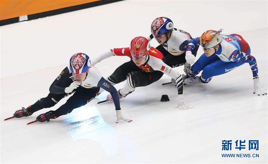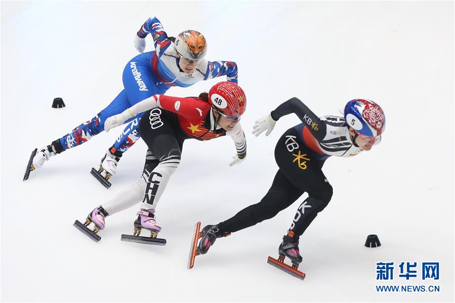 2月16日,中国选手韩雨桐(中)在女子1000米第二次比赛A组决赛中。 当日,在2019-2020赛季国际滑联短道速滑世界杯荷兰多德雷赫特站女子1000米第二次比赛A组决赛中,中国选手韩雨桐以1分32秒635的成绩获得银牌。 新华社记者郑焕松摄