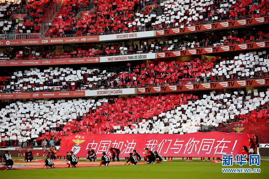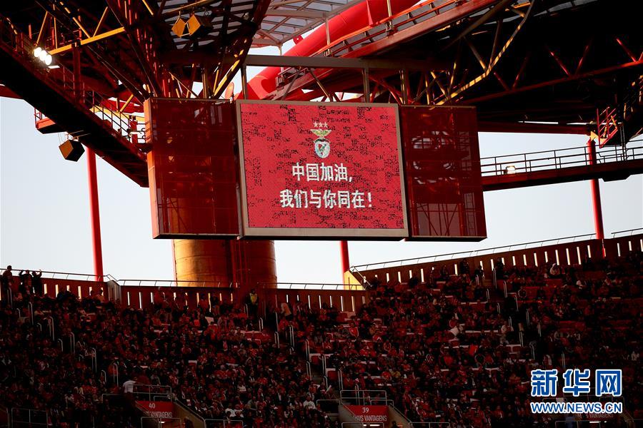 2月15日,赛前场内大屏幕显示中文标语“中国加油,我们与你同在!”。 当日,在里斯本举行的2019-2020赛季葡萄牙足球超级联赛第21轮本菲卡主场对阵布拉加的比赛前,本菲卡俱乐部邀请44名中葡两国球童参加开场仪式,并打出了“中国加油,我们与你同在!”的暖心标语。 新华社发(佩德罗·菲乌萨摄)