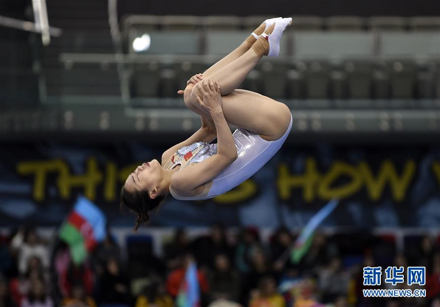 2月16日,中国选手刘灵玲在比赛中。 当日,在阿塞拜疆首都巴库举行的2020年蹦床世界杯系列赛巴库站女子网上个人决赛中,中国选手刘灵玲以54.945分的总成绩获得亚军。 新华社发(巴巴耶夫摄)