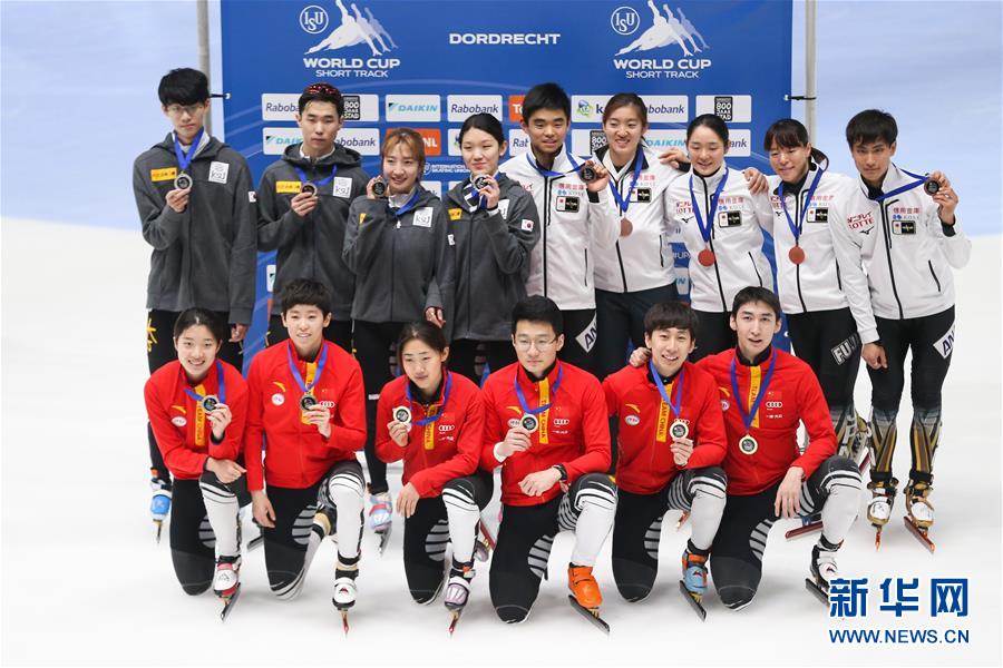 2月15日,冠军中国队(前),亚军韩国队(左上)和季军日本队在混合接力2000米颁奖仪式上合影。 当日,在2019-2020赛季国际滑联短道速滑世界杯荷兰多德雷赫特站2000米混合接力A组决赛中,中国队以2分42秒442的成绩夺得冠军。 新华社记者 郑焕松 摄