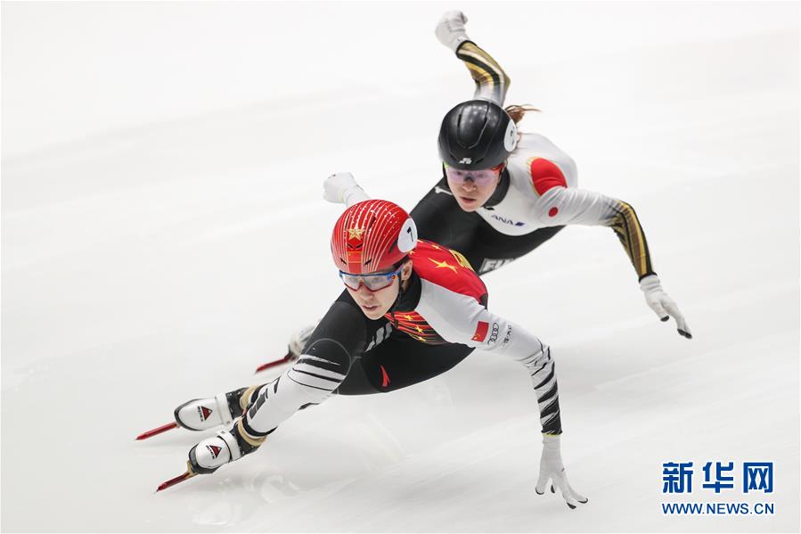 2月15日,中国队选手范可新(左)在混合接力2000米A组决赛中。 当日,在2019-2020赛季国际滑联短道速滑世界杯荷兰多德雷赫特站2000米混合接力A组决赛中,中国队以2分42秒442的成绩夺得冠军。 新华社记者 郑焕松 摄