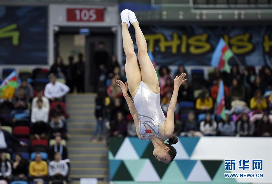 2月16日,中国选手朱雪莹在比赛中。 当日,在阿塞拜疆首都巴库举行的2020年蹦床世界杯系列赛巴库站女子网上个人决赛中,中国选手朱雪莹以55.810分的总成绩夺冠。 新华社发(巴巴耶夫摄)