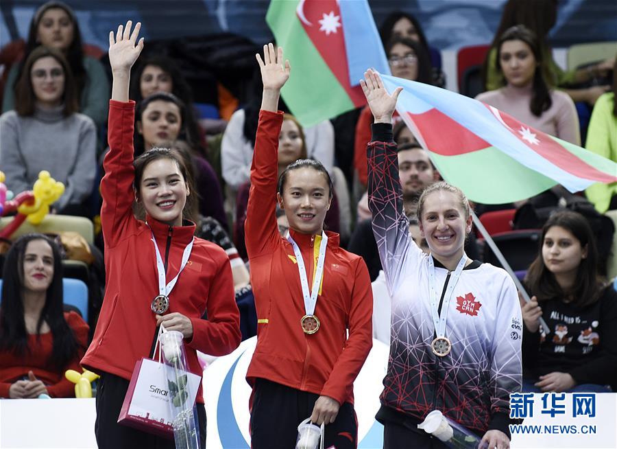 2月16日,冠军中国选手朱雪莹(中)、亚军中国选手刘灵玲(左)和季军加拿大选手萨曼莎·史密斯在领奖台上合影。 当日,在阿塞拜疆首都巴库举行的2020年蹦床世界杯系列赛巴库站女子网上个人决赛中,中国选手朱雪莹以55.810分的总成绩夺冠。 新华社发(巴巴耶夫摄)