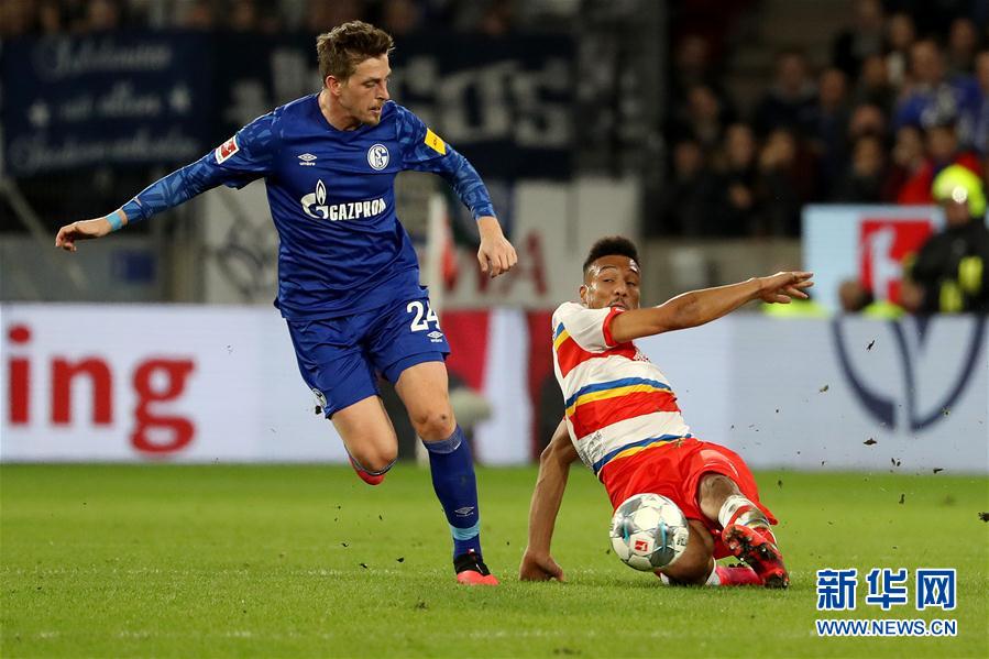 2月16日,沙尔克04队球员奥奇普卡(左)在比赛中与美因茨队球员奥尼西沃拼抢。 当日,在2019-2020赛季德国足球甲级联赛第22轮的一场比赛中,美因茨队主场以0比0战平沙尔克04队。 新华社发(约阿希姆·毕瓦勒兹摄)