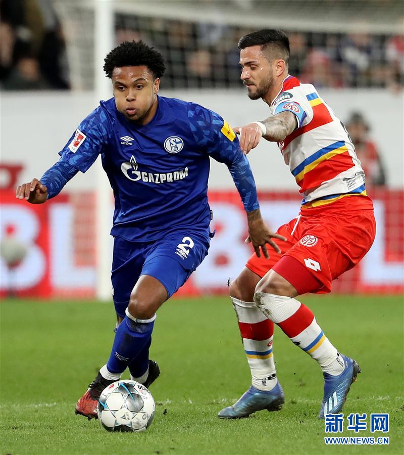2月16日,沙尔克04队球员麦肯尼(左)在比赛中与美因茨队球员拉察拼抢。 当日,在2019-2020赛季德国足球甲级联赛第22轮的一场比赛中,美因茨队主场以0比0战平沙尔克04队。 新华社发(约阿希姆·毕瓦勒兹摄)