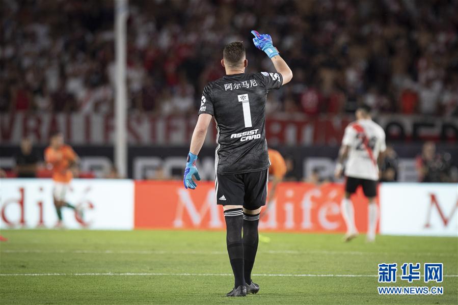 2月16日,河床队守门员阿尔马尼在比赛中穿着印有中文名字的球衣。 当日,在阿根廷首都布宜诺斯艾利斯举行的2019-2020赛季阿根廷超级联赛第20轮河床队主场对阵班菲尔德队的比赛中,河床俱乐部在球场屏幕上投放了“加油中国 加油武汉”的西班牙语标语,河床队球员穿着印有中文名字的球衣,以表达对中国抗击疫情的支持。 新华社发(马丁·萨巴拉摄)