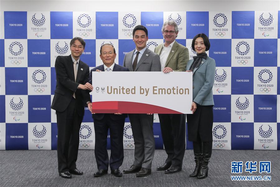 2月17日,东京奥组委首席执行官武藤敏郎(左二)、副秘书长宫古正章(左一)和东京奥运会口号选定委员会成员与东京奥运会和残奥会口号“United by Emotion”合影。 当日,东京奥组委在日本东京召开新闻发布会,正式宣布2020年东京奥运会和残奥会的口号:“United by Emotion”, 中文可以叫“激情聚会”。 新华社记者杜潇逸摄