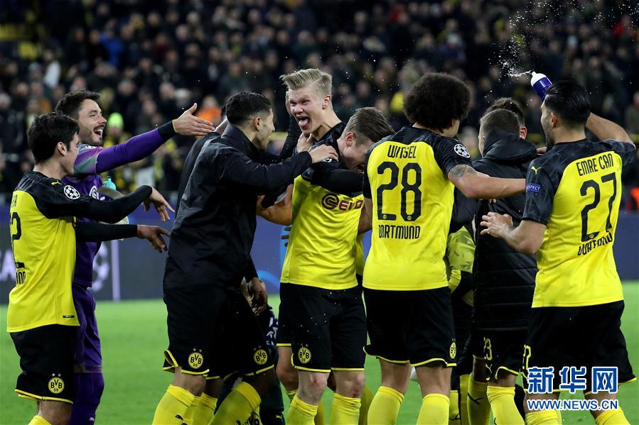 2月18日,多特蒙德队球员在比赛后庆祝。 当日,在德国多特蒙德举行的2019-2020赛季欧冠联赛八分之一决赛首回合比赛中,德甲多特蒙德队主场以2比1战胜法甲巴黎圣日耳曼队。 新华社发(约阿希姆·毕瓦勒兹 摄)