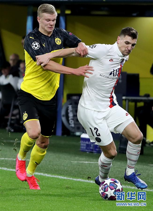 2月18日,巴黎圣日耳曼队球员穆尼耶(右)在比赛中与多特蒙德队球员哈兰德拼抢。 当日,在德国多特蒙德举行的2019-2020赛季欧冠联赛八分之一决赛首回合比赛中,德甲多特蒙德队主场以2比1战胜法甲巴黎圣日耳曼队。 新华社发(约阿希姆·毕瓦勒兹 摄)