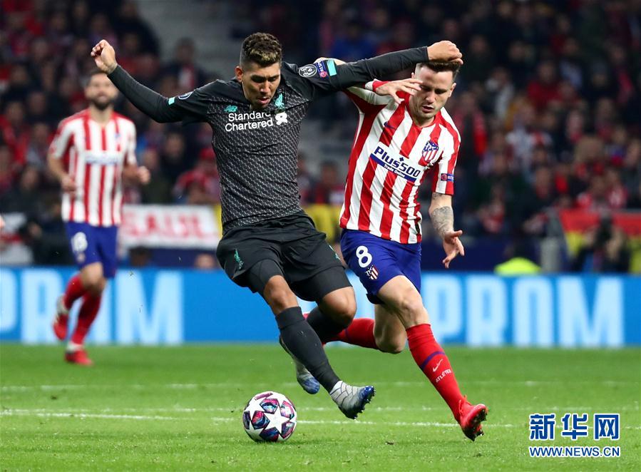 2月18日,马德里竞技队球员萨乌尔(右)和利物浦队球员菲尔米诺在比赛中拼抢。 当日,在西班牙马德里举行的2019-2020赛季欧冠联赛八分之一决赛首回合比赛中,西甲马德里竞技队主场以1比0战胜英超利物浦队。 新华社/路透
