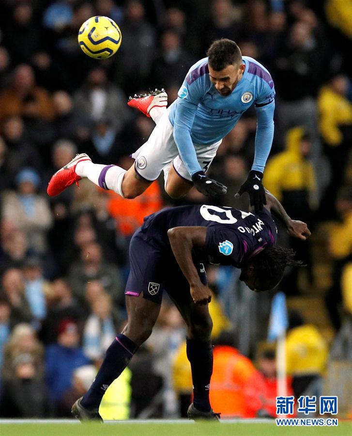 2月19日,曼彻斯特城队球员奥塔门迪(上)与西汉姆联队球员安东尼奥拼抢。 当日,在2019-2020赛季英格兰足球超级联赛第26轮比赛中,曼彻斯特城队主场以2比0战胜西汉姆联队。 新华社/路透