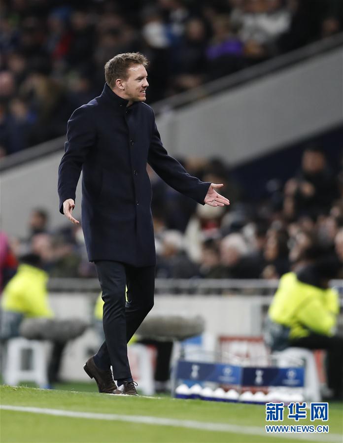 2月19日,莱比锡队主帅纳格尔斯曼在场边观战。 当日,在2019-2020赛季欧洲足球冠军联赛十六强赛首回合比赛中,英超托特纳姆热刺队主场以0比1不敌德甲莱比锡队。 新华社记者 韩岩 摄