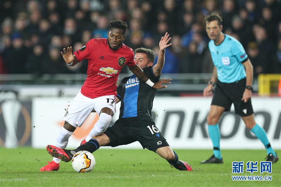 2月20日,曼联队球员弗雷德(左)在比赛中遭遇布鲁日队球员施里弗斯犯规。 当日,在比利时布鲁日进行的2019-2020赛季欧罗巴联赛1/16决赛首回合比赛中,英超曼彻斯特联队客场以1比1战平比甲布鲁日队。 新华社记者 郑焕松 摄