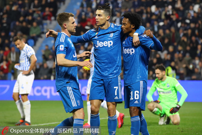 人民网北京2月23日电 北京时间今天凌晨1:00,2019-2020赛季意甲第25轮比赛的一场大战打响,意甲豪门尤文图斯会在客场挑战斯帕尔。上半场比赛,C罗打入一球但是被判越位在先,但是在半场尾声接到夸德拉多的助攻包抄射门得手。下半场比赛,拉姆塞挑射得分,佩塔尼亚点射打入一球,C罗的任意球踢在横梁上弹出。全场比赛结束,尤文图斯客场2-1击败斯帕尔获得了胜利。