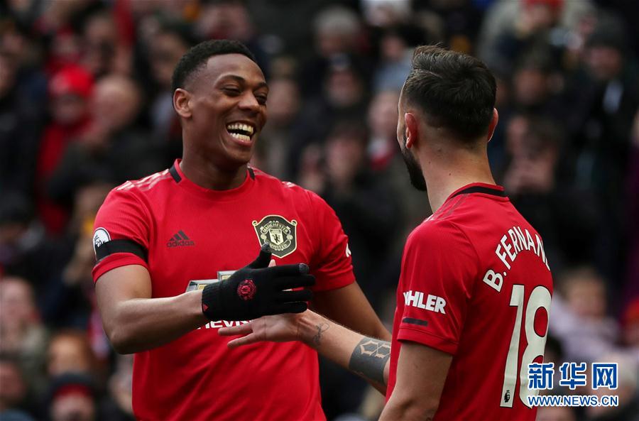 2月23日,曼联队球员马夏尔(左)进球后与队友布鲁诺庆祝。 当日,在2019-2020赛季英超联赛第27轮比赛中,曼彻斯特联队主场以3比0战胜沃特福德队。 新华社/路透