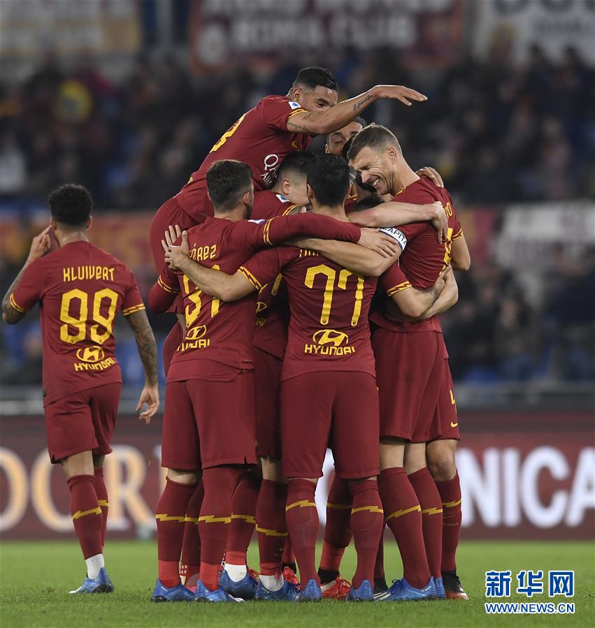 2月23日,罗马队球员在比赛中庆祝进球。 当日,在2019-2020赛季意大利足球甲级联赛第25轮比赛中,罗马队主场以4比0战胜莱切队。 新华社发(奥古斯托·卡萨索利摄)