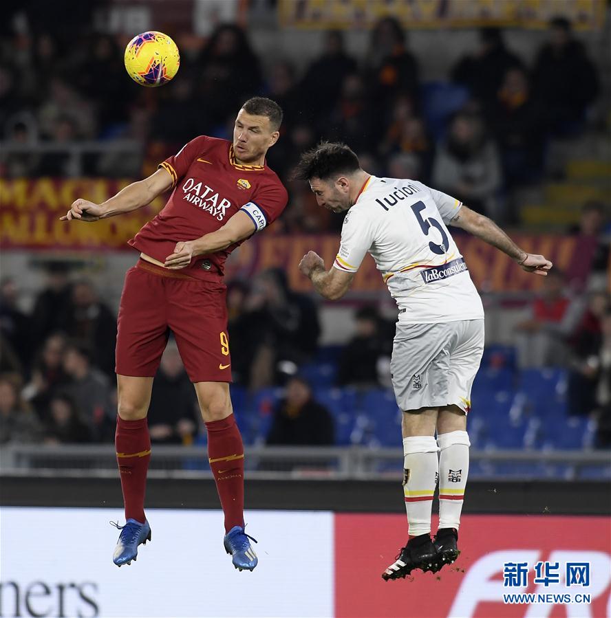 2月23日,罗马队球员哲科(左)在比赛中和莱切队球员卢乔尼争顶。 当日,在2019-2020赛季意大利足球甲级联赛第25轮比赛中,罗马队主场以4比0战胜莱切队。 新华社发(奥古斯托·卡萨索利摄)