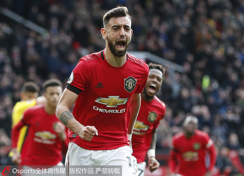 人民网北京2月24日电(杨磊) 北京时间2月23日晚,2019/20赛季英超第27轮曼联主场3比0完胜沃特福德,布鲁诺打入处子球又助攻格林伍德破门,马夏尔破门。