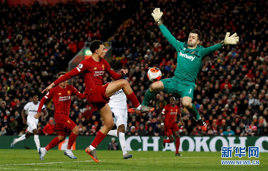 2月24日,利物浦队球员阿诺德(左)在比赛中和西汉姆联队守门员法比安斯基拼抢。 当日,在2019-2020赛季英格兰足球超级联赛第27轮比赛中,利物浦队主场以3比2战胜西汉姆联队。 新华社/路透