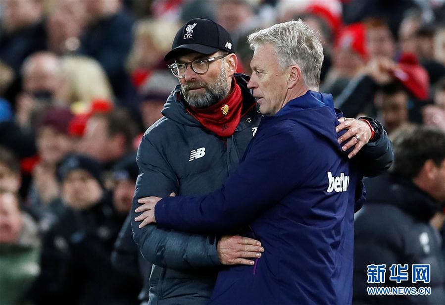 2月24日,利物浦队主教练克洛普(左)在赛后和西汉姆联队主教练莫耶斯致意。 当日,在2019-2020赛季英格兰足球超级联赛第27轮比赛中,利物浦队主场以3比2战胜西汉姆联队。 新华社/路透