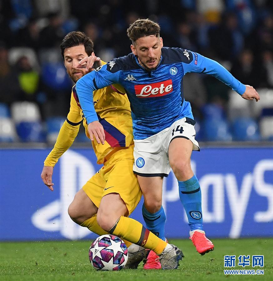 2月25日,巴塞罗那队球员梅西(左)在比赛中和那不勒斯队球员梅尔滕斯拼抢。 当日,在2019-2020赛季欧洲足球冠军联赛八分之一决赛首回合比赛中,西甲巴塞罗那队客场以1比1战平意甲那不勒斯队。 新华社发(阿尔贝托·林格里亚摄)