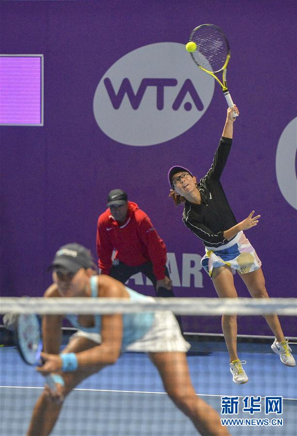 2月25日,徐一璠(后)/梅利查在比赛中。 当日,在卡塔尔首都多哈进行的2020年WTA卡塔尔公开赛双打第二轮比赛中,徐一璠(中国)/梅利查(美国)组合以2比1战胜段莹莹(中国)/库德梅托娃(俄罗斯)组合,晋级八强。 新华社发(尼库摄)